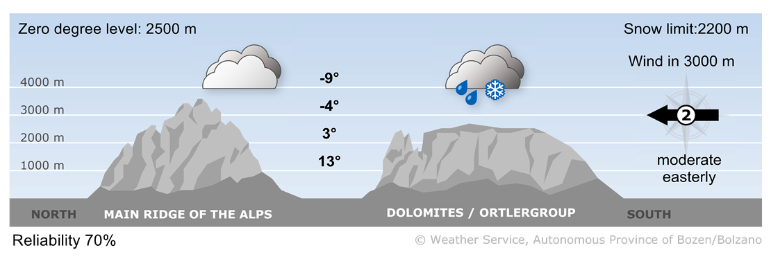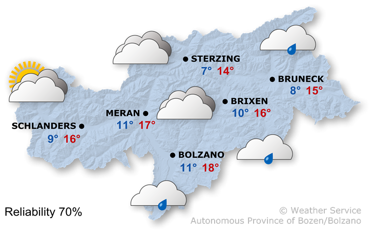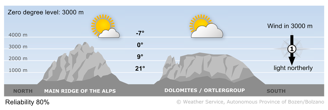 On Monday, there will be a mix of sun and clouds, with only a few isolated showers. A Föhn wind will blow in the northern valleys.