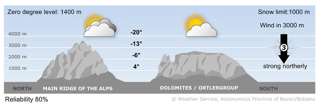 In the afternoon in the south the weather will be sunny, while along the border ridge more intense clouds accompanied by a few snow showers. Föhn winds will blow in many valleys.
