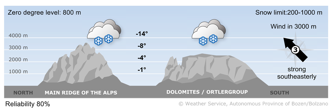 There will also be widespread precipitation in the afternoon. The snow line will generally be at the bottom of the valley or temporarily rising to an altitude of 800/1000 m. Towards evening, with the arrival of the Föhn wind, the precipitation will cease, starting with the West. Only along the border ridge will snowfall continue throughout the night.