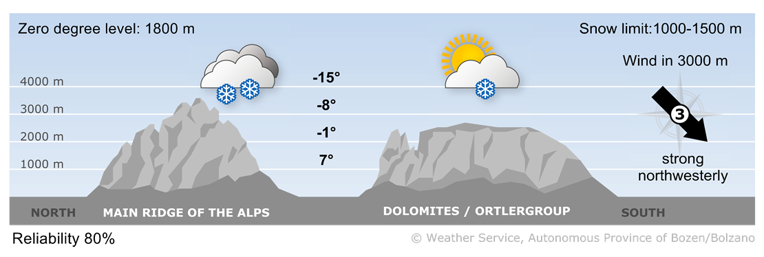 Clouds will prevail over the main Alpine ridge, with intermittent sunshine in the south at first. In the afternoon, rain or snow will begin to fall in the north of South Tyrol, with the snow line rising to 1200-1400 m. The precipitation may also spread further south.