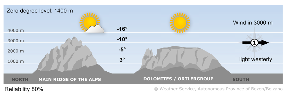 Throughout South Tyrol, the sun will shine from early to late and the sky is often cloudless. The north wind weakens as the day progresses.