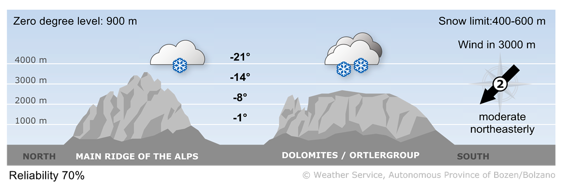 Maximum temperatures between -1° and +6°, locally higher values will be possible due to the foehn wind.