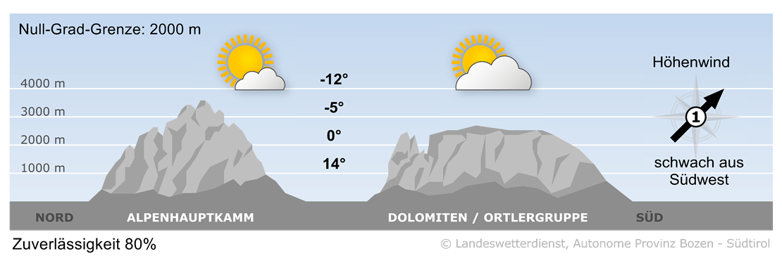 Der Dienstag verläuft überwiegend sonnig, am Alpenhauptkamm halten sich noch ein paar Wolken. In vielen Tälern weht Nordföhn.